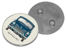 ø5cm round metal fridge magnet, printed with the front elevation of the vehicle. |